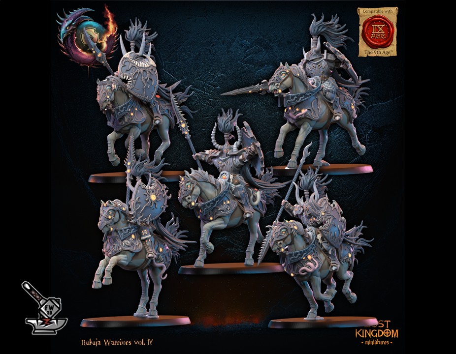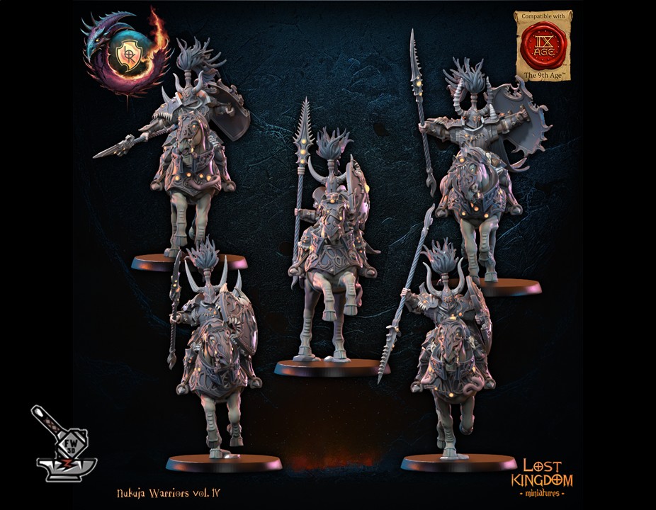 Les  » 5 Chevaliers de Nujuka montés  » de la collection  » Nujuka Warriors vol IV « , sculptés par Lost Kingdom Miniatures, sont en résine de haute qualité. Les figurines peuvent être sous-couchées à la bombe de peinture ou être peintes directement au pinceau.