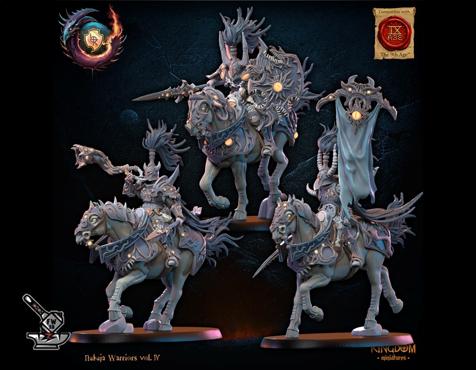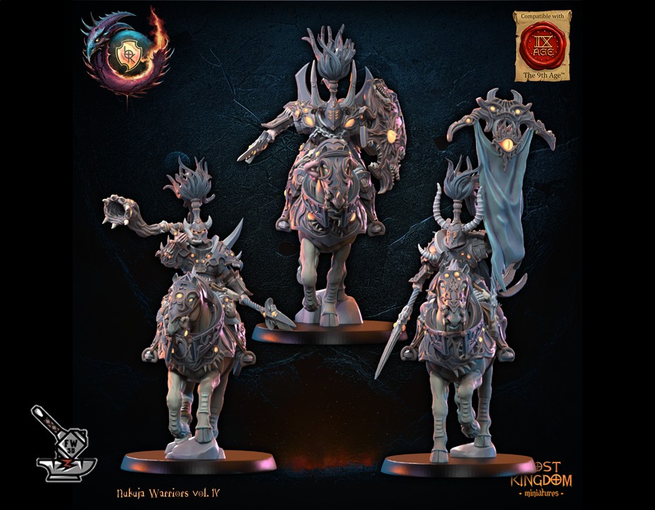 L’  » Etat-major des chevaliers de Nujuka montés  » de la collection  » Nujuka Warriors vol IV « , sculpté par Lost Kingdom Miniatures, est en résine de haute qualité. Les figurines peuvent être sous-couchées à la bombe de peinture ou être peintes directement au pinceau.