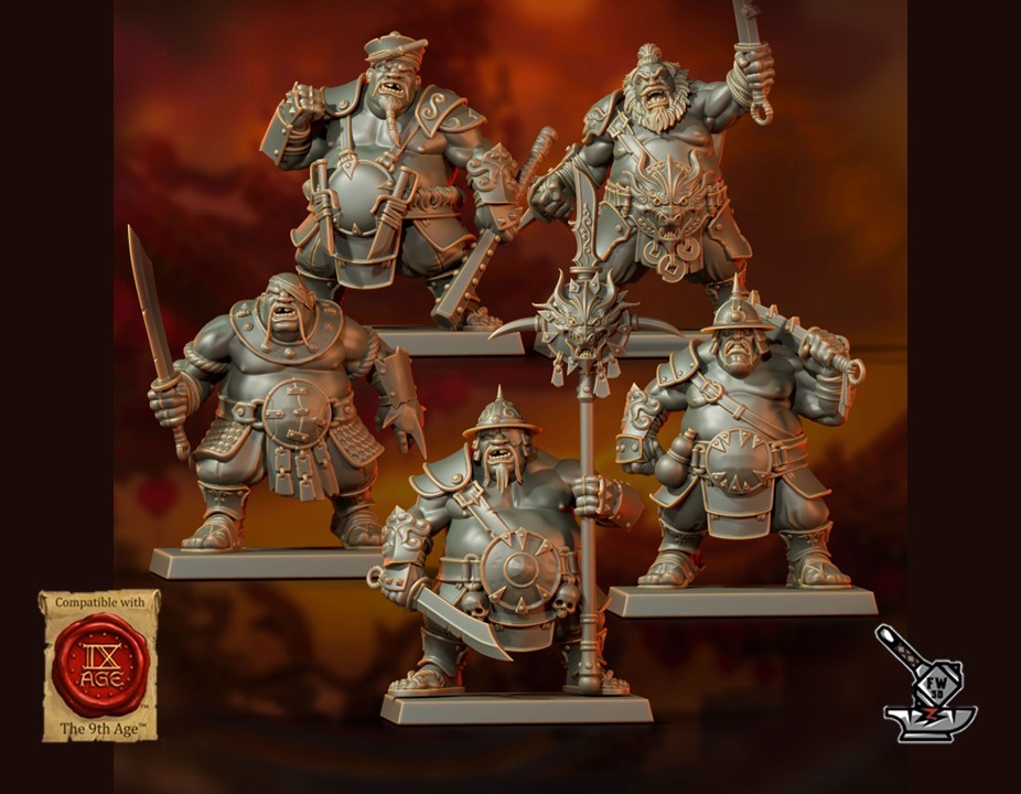 Les « 5 Mercenaires de Jade Ogres de l’Empire Céleste », sculptés par Punga Miniatures, sont en résine de haute qualité. Les figurines peuvent être sous-couchées à la bombe de peinture ou être peintes directement au pinceau.
