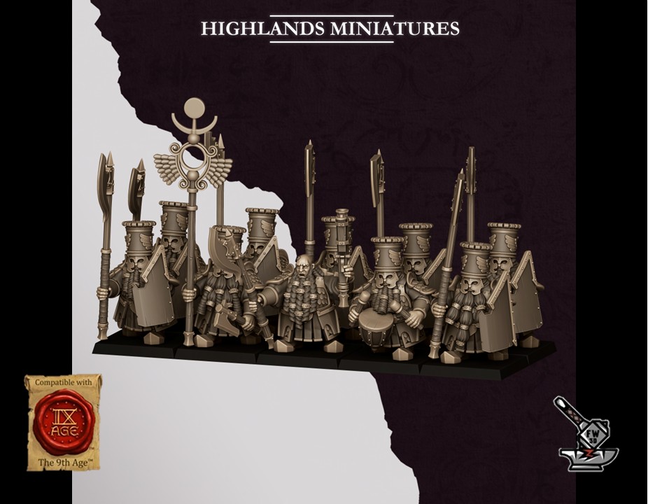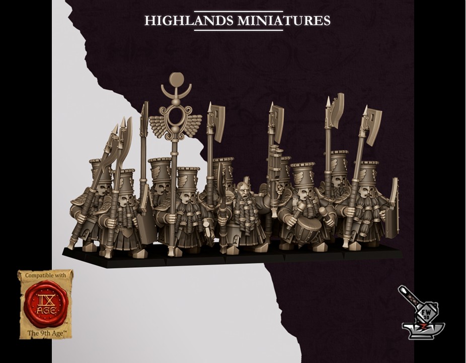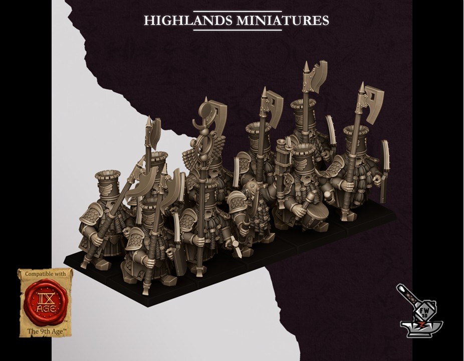 Les « 10 Gardes lourds des Sons Of Marduk avec armes et boucliers », sculptés par Highlands Miniatures, sont en résine de haute qualité. Les figurines peuvent être sous-couchées à la bombe de peinture ou être peintes directement au pinceau.