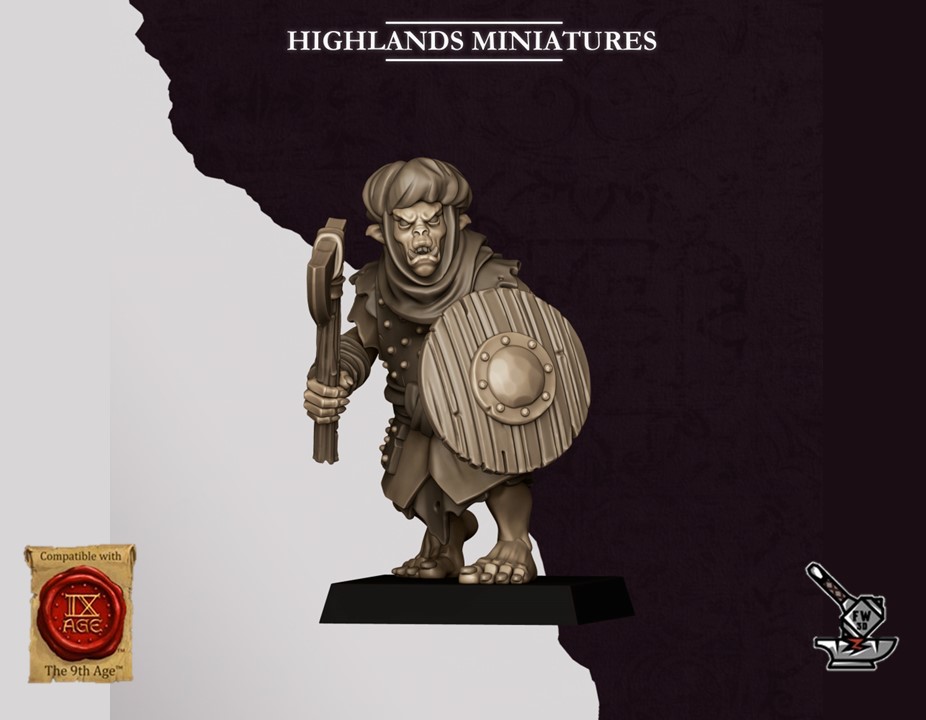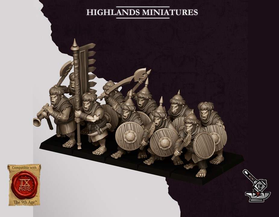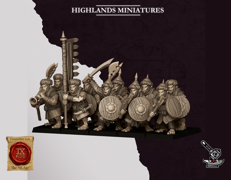 Les « 10 Guerriers Hobgobelins des Sons of Marduk avec armes et boucliers », sculptés par Highlands Miniatures, sont en résine de haute qualité. Les figurines peuvent être sous-couchées à la bombe de peinture ou être peintes directement au pinceau.