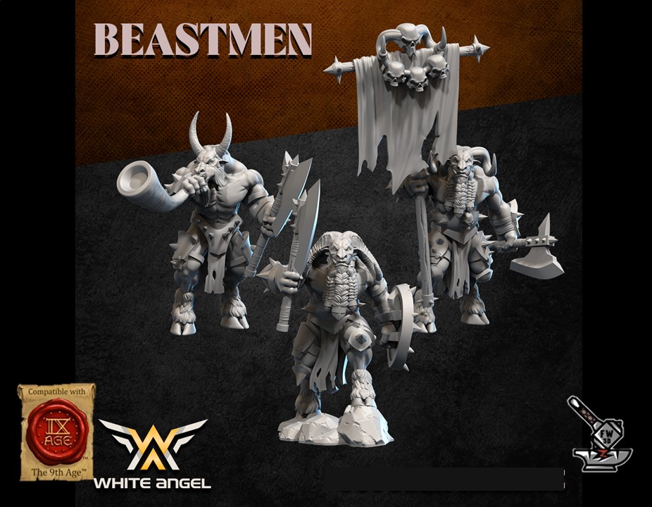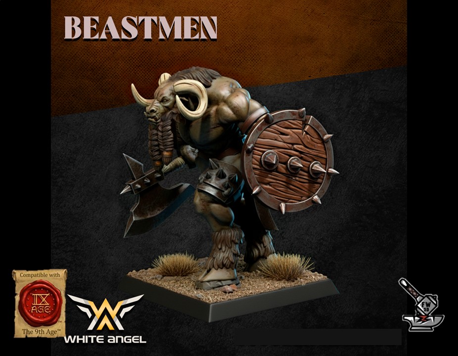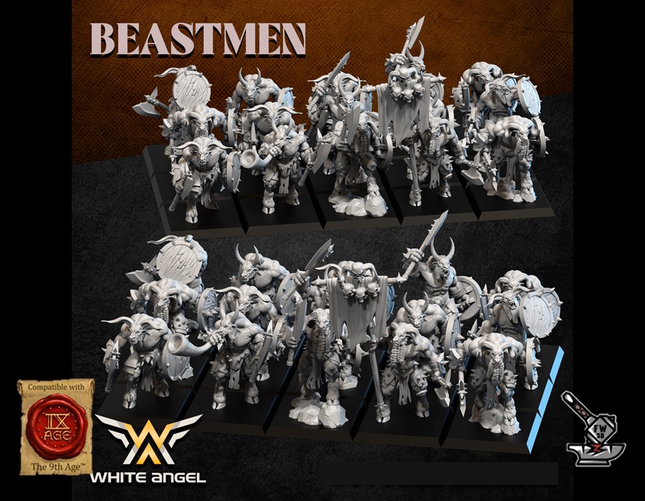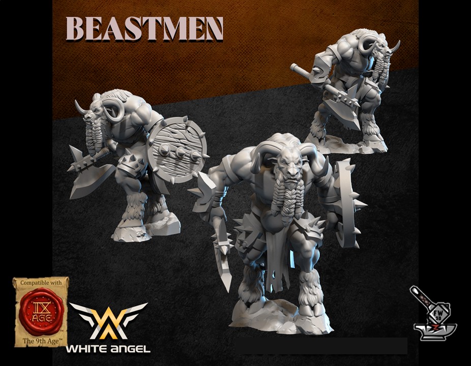 Les « 10 Guerriers Homme-bêtes avec armes de base et boucliers », sculptés par White Angel Miniatures, sont en résine de haute qualité. Les figurines peuvent être sous-couchées à la bombe de peinture ou être peintes directement au pinceau.