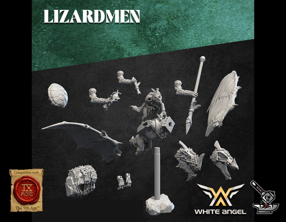 Les » 3 Skycrawler Lézards avec sarbacanes et boucliers « , sculptés par White Angel Miniatures, sont en résine de haute qualité. Les figurines peuvent être sous-couchées à la bombe de peinture ou être peintes directement au pinceau.