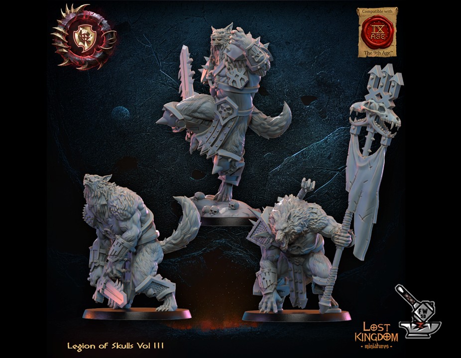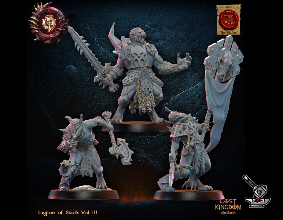 The ” Héro + 13 Guerriers Mooncurse Forsaken avec EMC ” of the collection ” Legion of skulls vol 3 “, sculpted by Lost Kingdom Miniatures, are made of high quality resin. The figures can be undercoated with spray paint or painted directly with a brush.